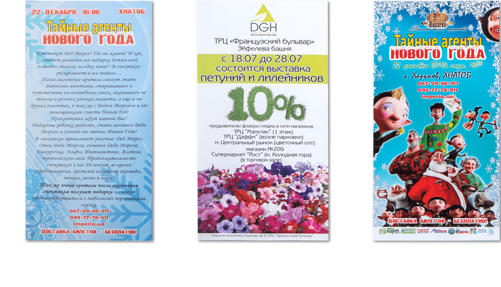 Чтобы деньги не были выброшены вместе с флаером в урну, мы сделаем их максимально интересными. Как вариант, мы можем предложить вам целый перечень информационных нюансов, интересных многим людям, которые могут сопровождать вашу информацию на флаере и задержат внимание читающего его человека.